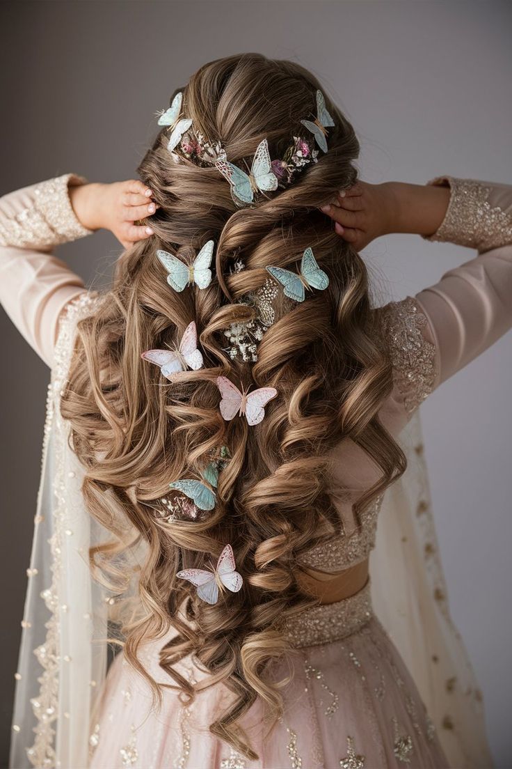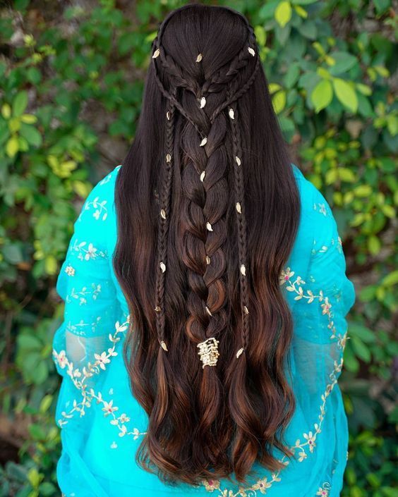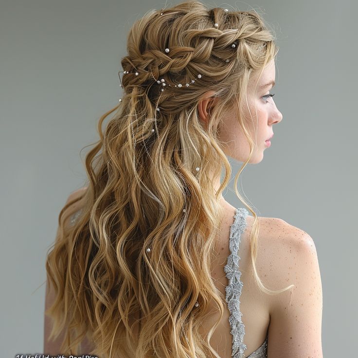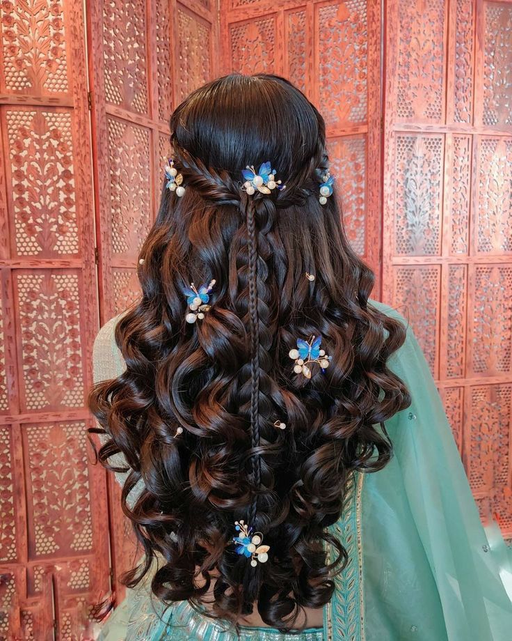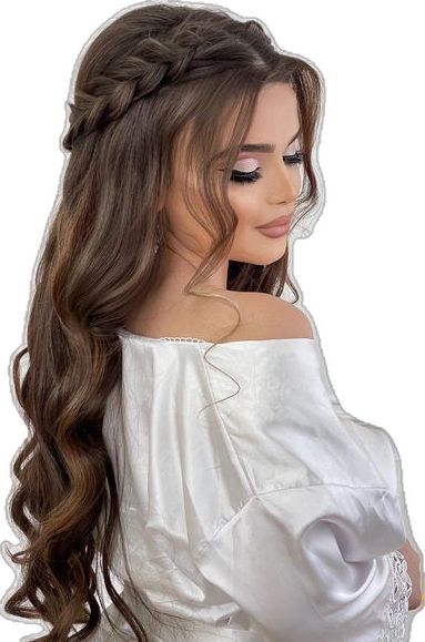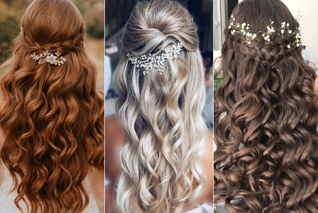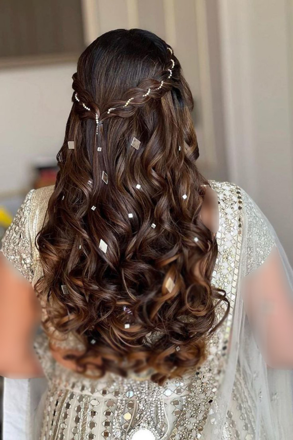 نصف موها از بالا جمع شده و بقیه باز باقی میمانند. با گیرههای مرواریدی یا نگیندار تزئین میشود.