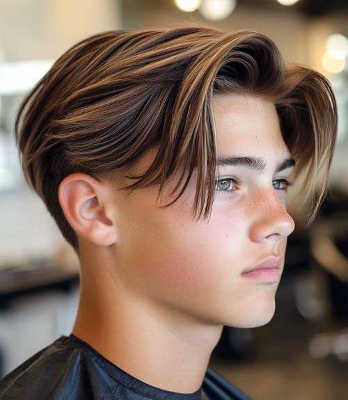 موها از کنار به صورت تمیز فرق داده شده و با ژل حالت میگیرند. این سبک برای ظاهری مرتب و رسمی عالی است.
