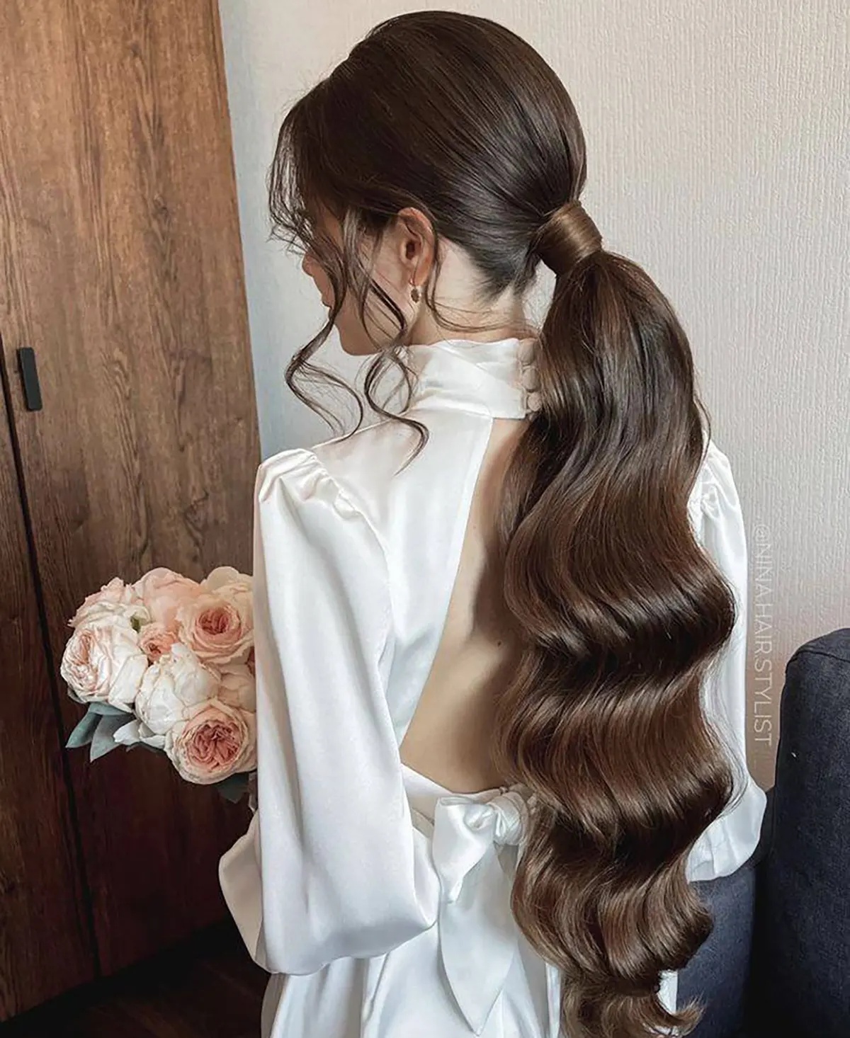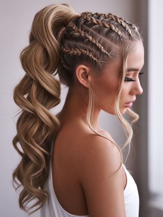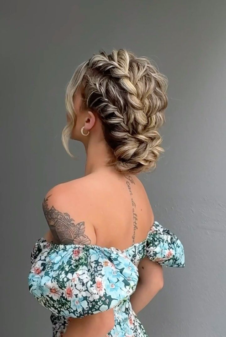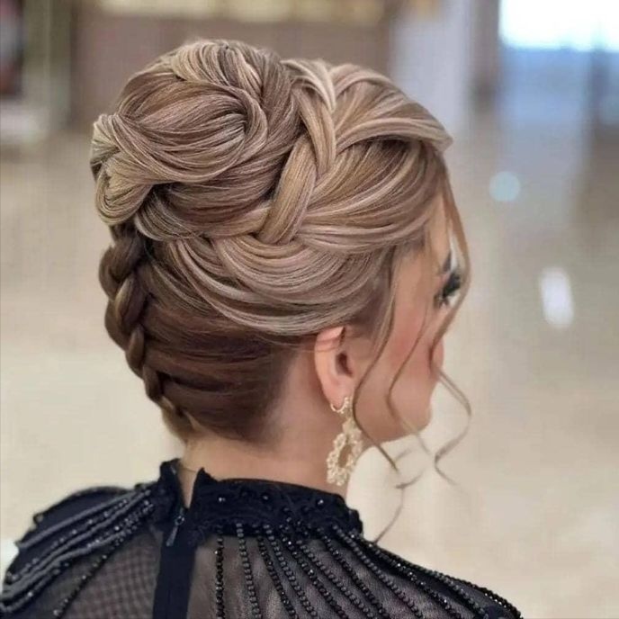 موهای بالا بلند نگه داشته شده و با حجم دهنده به یک سمت حالت داده میشوند.