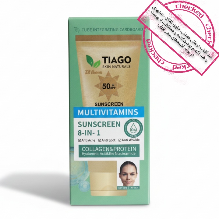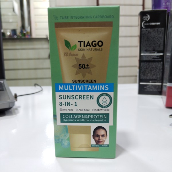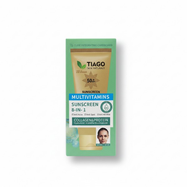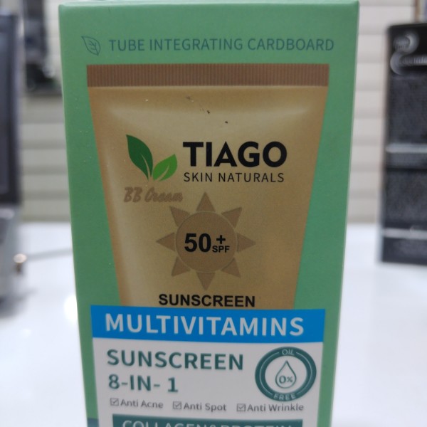 ضد آفتاب رنگی معدنی ۸ کاره تیاگو (TIAGO) یک بی بی کرم (BB Cream) درمانی پیشرفته با SPF50 محصول کشور چین با فرمولاسیون و تکنولوژی کره جنوبی است. این محصول با فرمولاسیون معدنی و گیاهی، علاوه بر محافظت کامل در برابر اشعههای UVA و UVB، دارای خواص ضد چروک، ضد آکنه، روشنکننده و آبرسان قوی حاوی هیالورونیک اسید و نیاسینامید میباشد.
